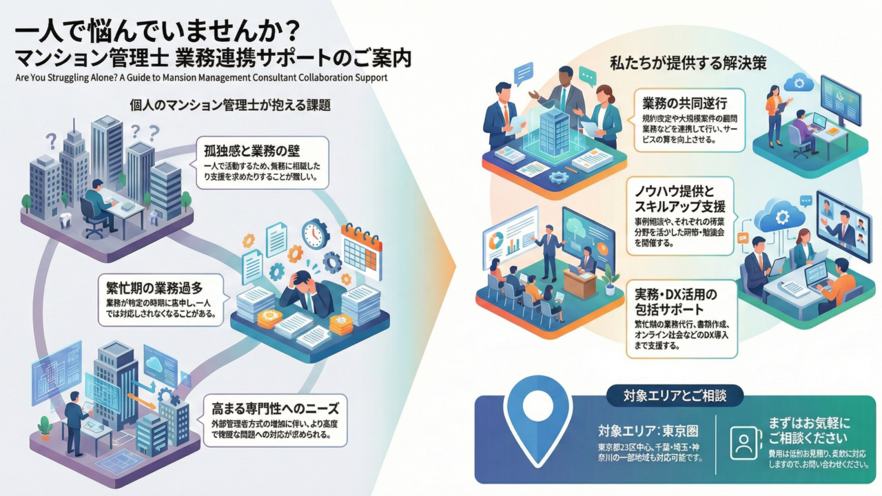 しかし、個人で活動するマンション管理士は、孤独を感じたり、繁忙期に業務が集中して対応しきれなくなったりする場面も少なくありません。