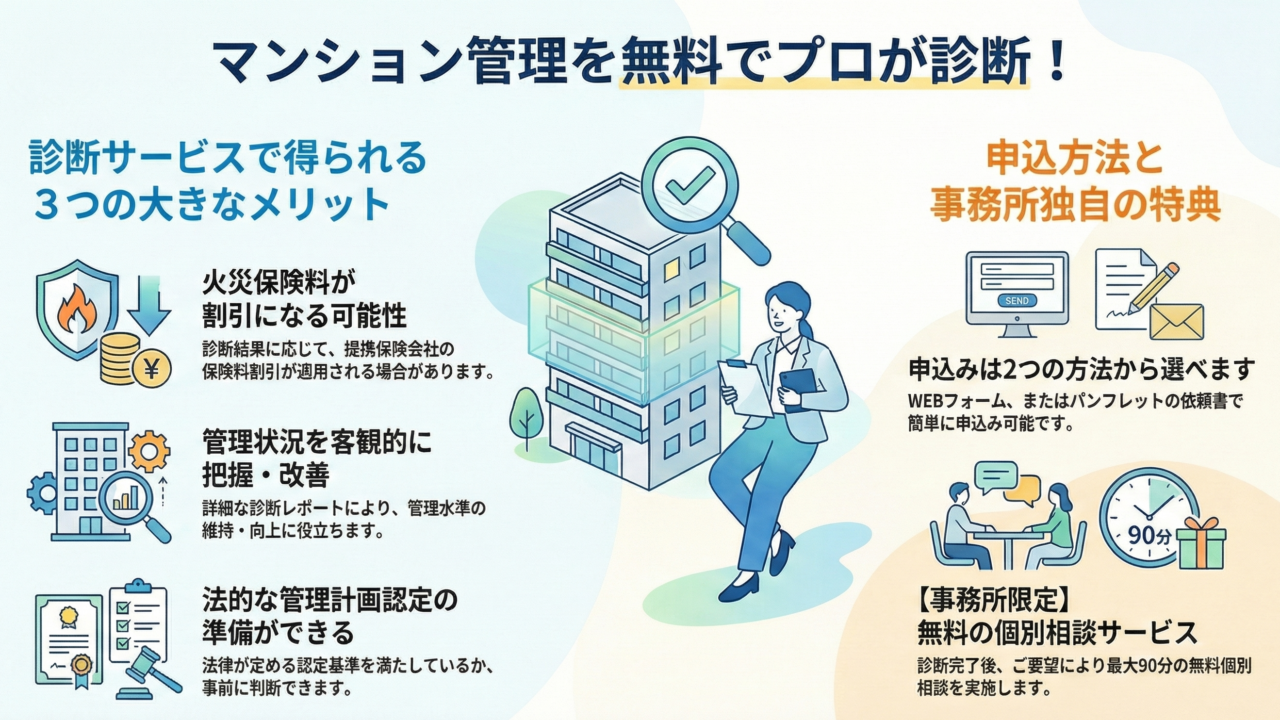 診断マンション管理士である当社代表マンション管理士(片岡 忠朗)にマンション管理適正化診断サービスの診断をご依頼されて診断業務が全て完了した場合には、ご要望により管理組合の無料個別相談を実施させて頂きます。