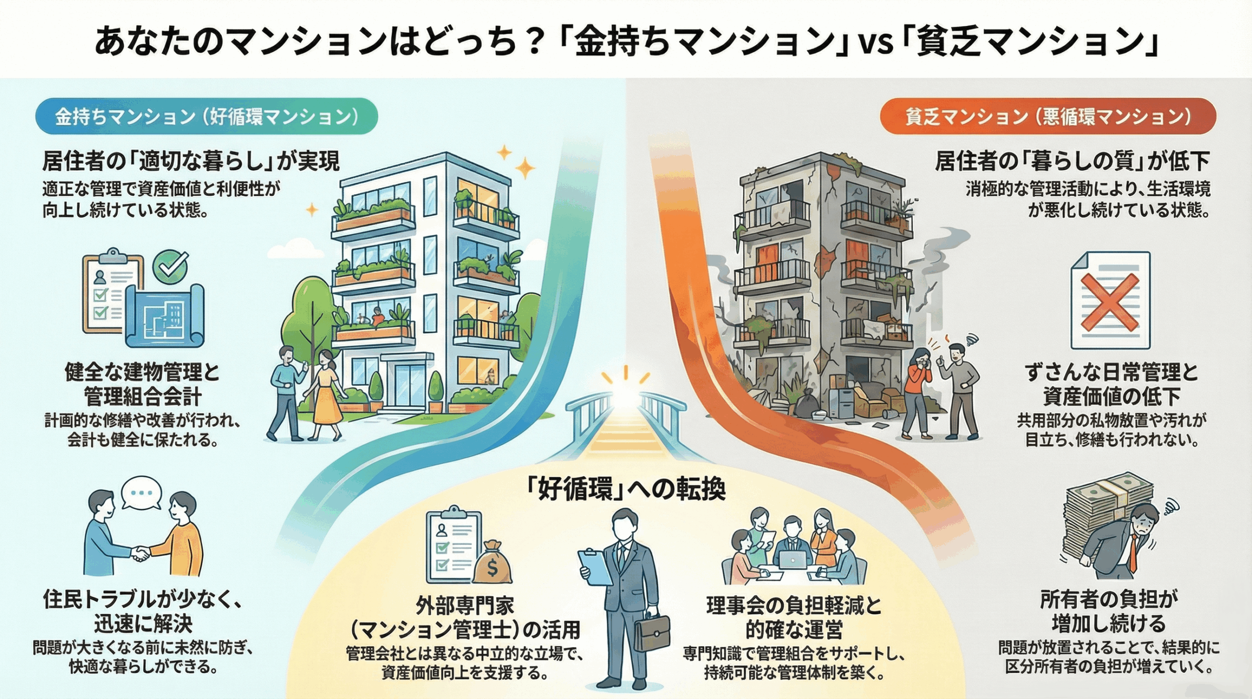 また、金持ちマンションとは正反対に「マンション居住者の方たちの暮らしの質が低下し続けているマンション」のことを貧乏マンションと定義づけています。